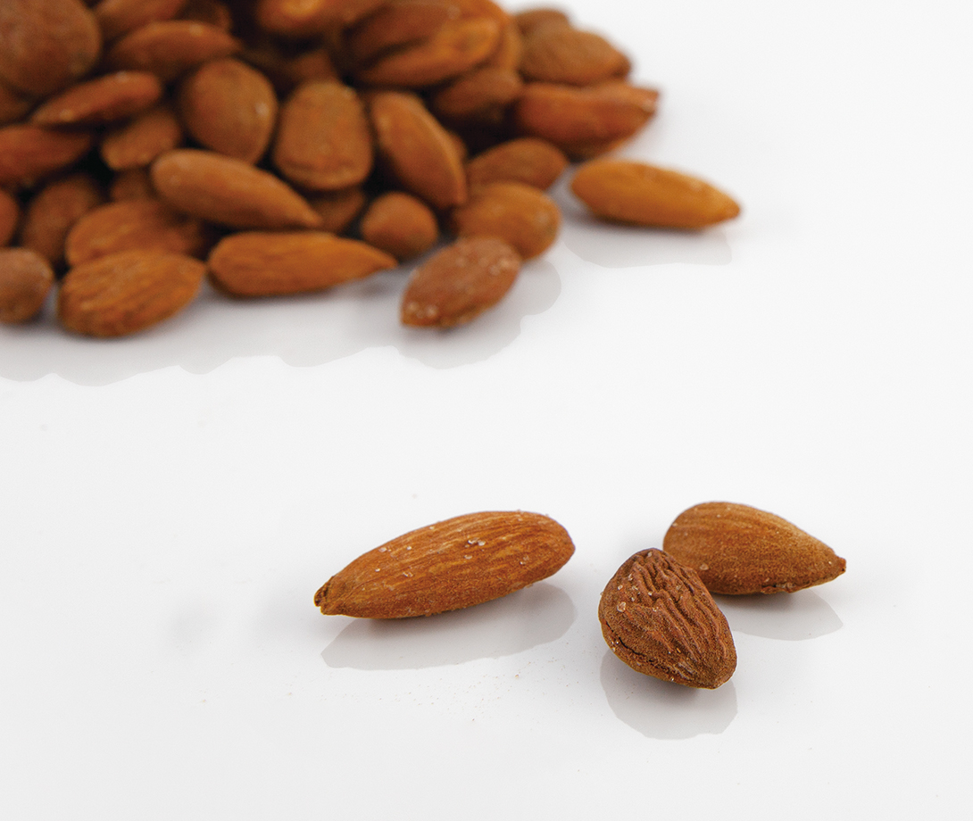 Ganze, ungeschälte Mandeln, geräuchert, geröstet und gesalzen. Die Mandeln kommen aus Pakistan von Bauernfamilien aus den Hochebenen im Norden des Landes.