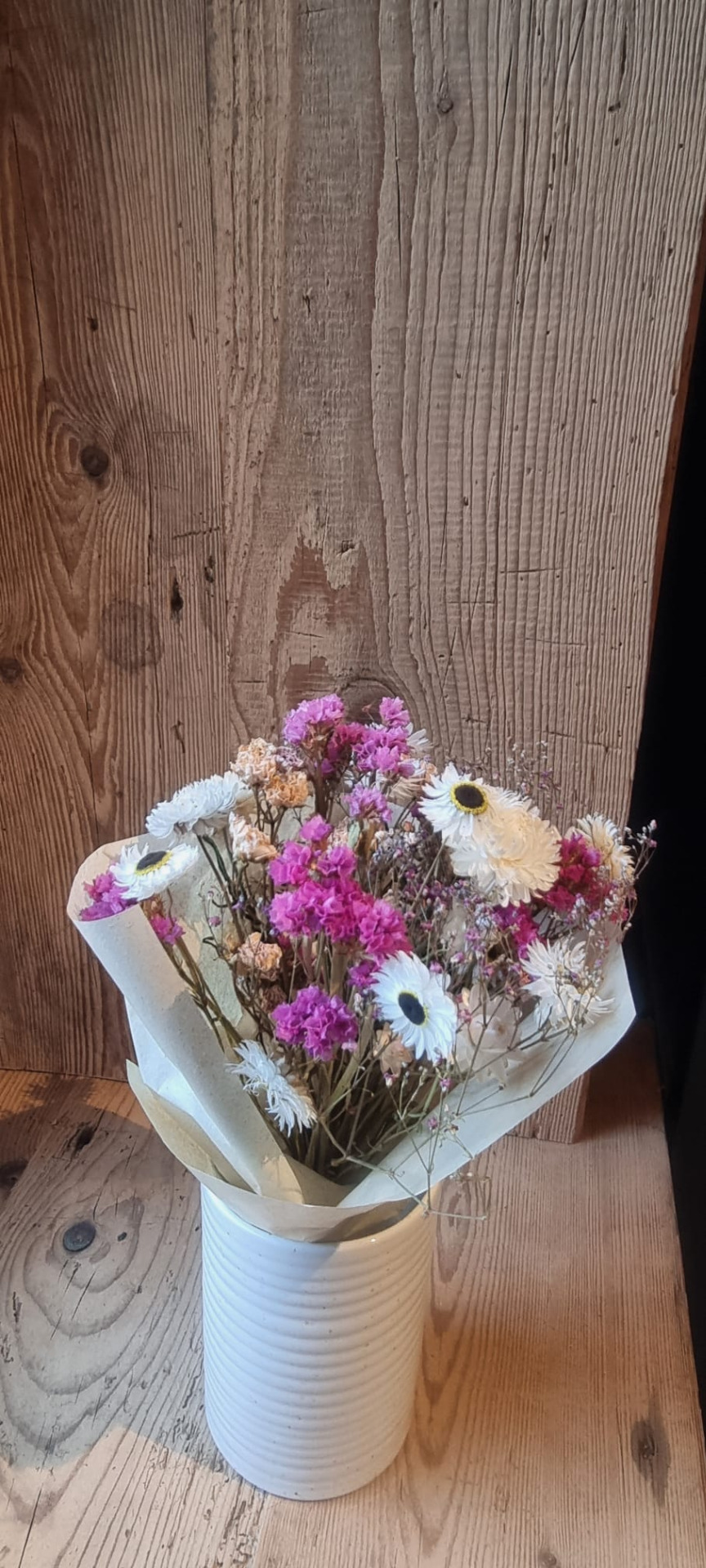 Du erhältst einen individuell zusammengestellten Strauss aus regionalen und biologisch angebauten Trockenblumen von unserem Blumenfeld. Angebaut und gebunden nach den Grundsätzen der Slowflower Bewegung (https://www.slowflower-bewegung.de/).